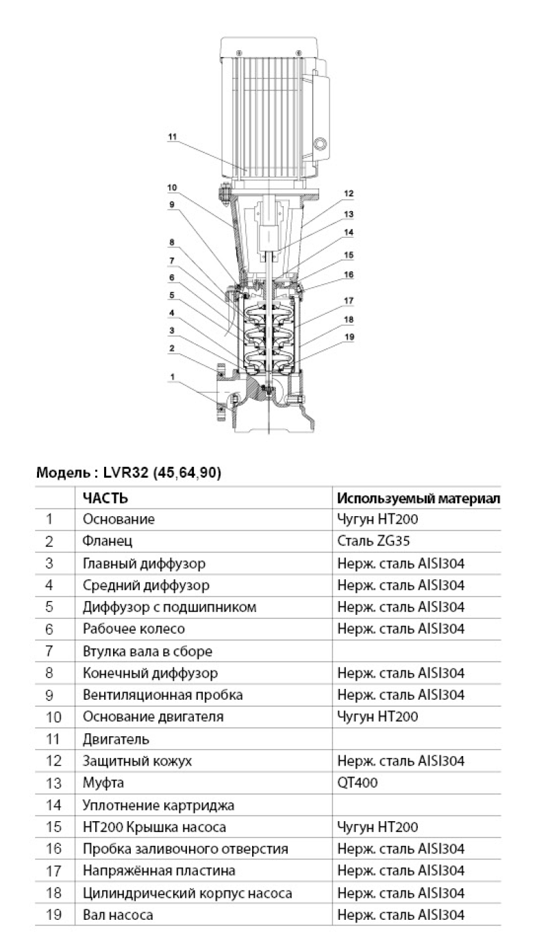 Насос LEO LVR 32-11 предназначен для перекачки невязких, негорючих, невзрывоопасных, не содержащих твердых включений и волокон жидкостей